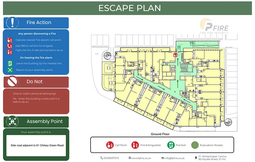 At FP Fire, we create detailed evacuation plans that show safe escape routes, assembly points, and key responsibilities, helping ensure everyone can leave the building quickly and safely.